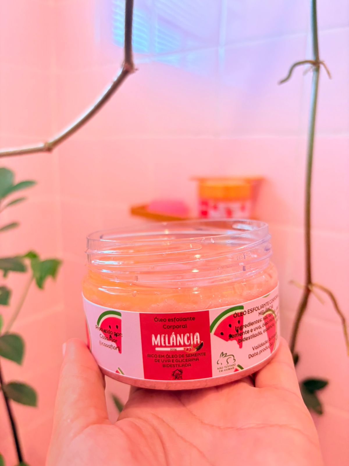 Óleo esfoliante corporal de melância, rico em óleo de semente de uva e glicerina bidestilada.
